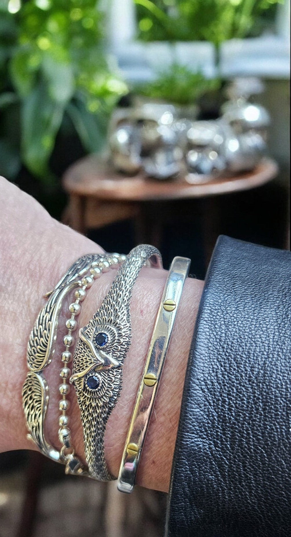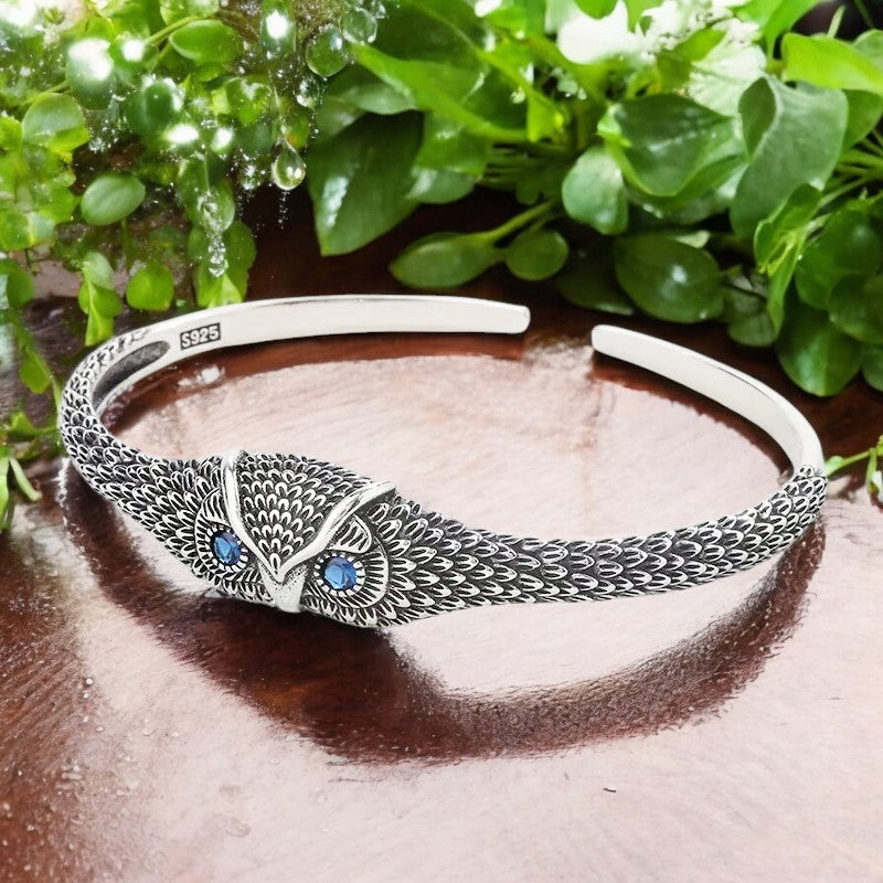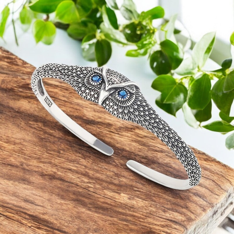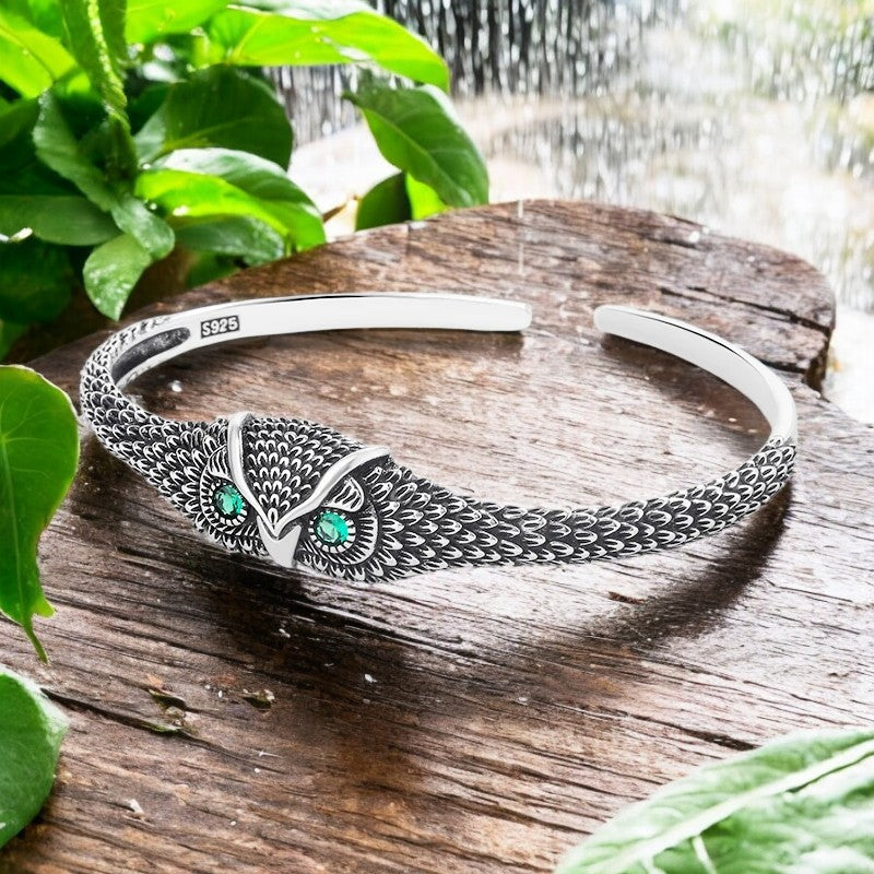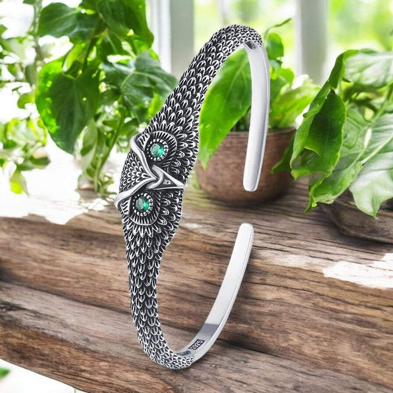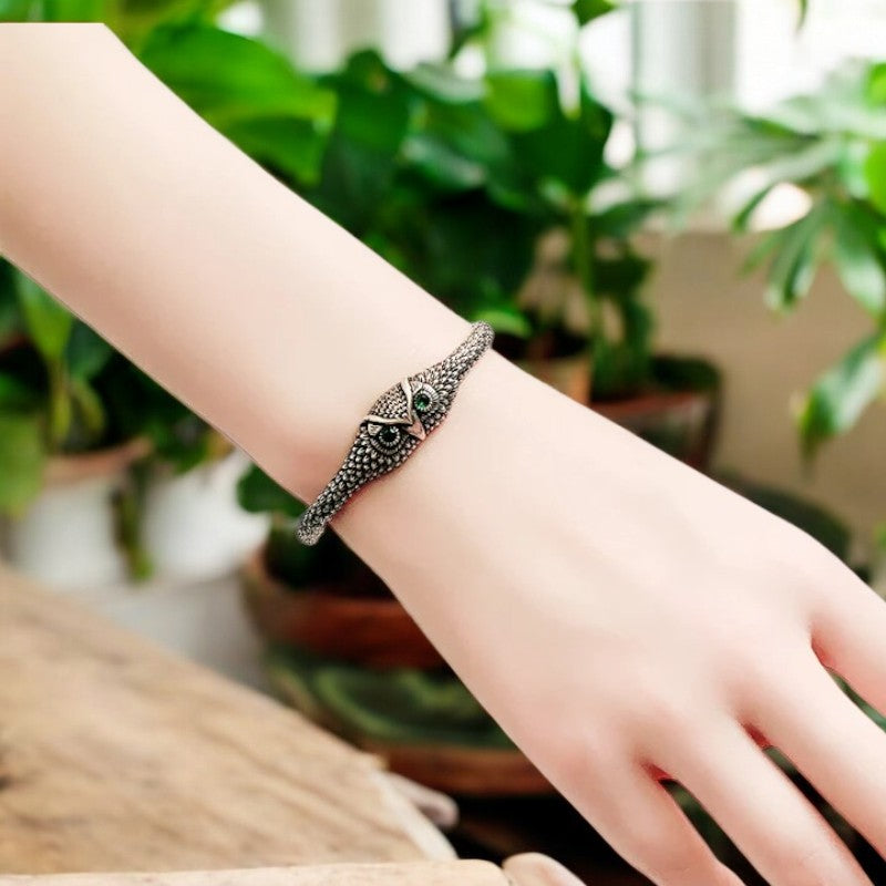 Au centre, ne tête de chouette finement ciselée comme le bracelet, au regard perçant serti de pierres bleues ou vertes - comme deux éclats de nuit qui ne laissent rien passer.